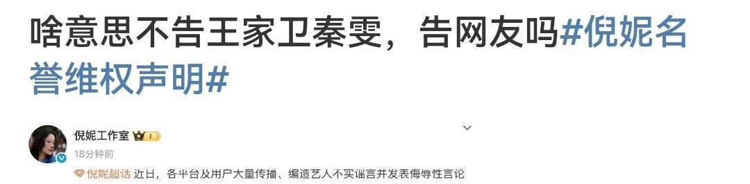 不是替谁说话,单就事论事觉得,那些喊话倪妮去告王家卫和秦雯的人更是脑回路清奇虽然他俩背后蛐蛐别人这事儿挺掉面儿,但秦说的那个意思不就是刘诗诗去找过她,但是倪妮没有吗?也没听见她说倪妮有后台,有靠山啊,告啥啊?